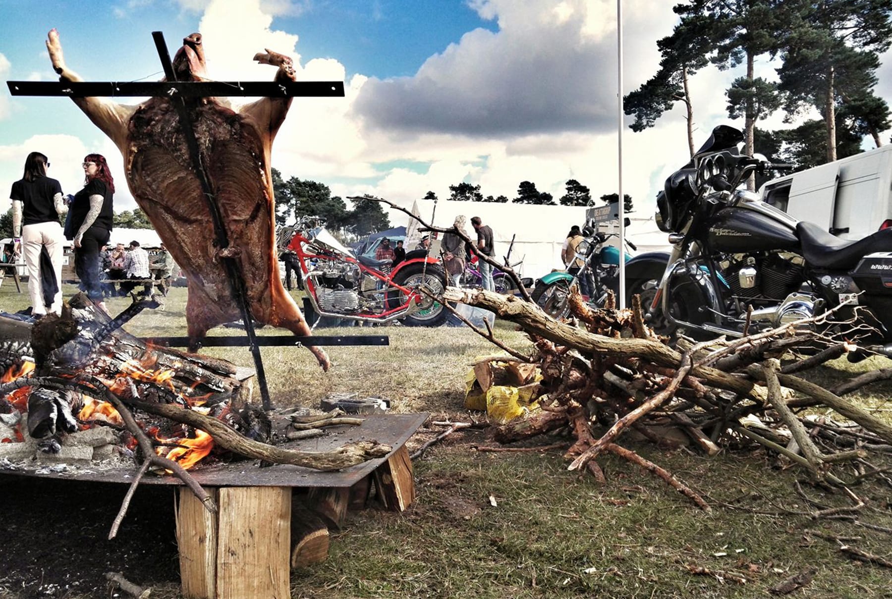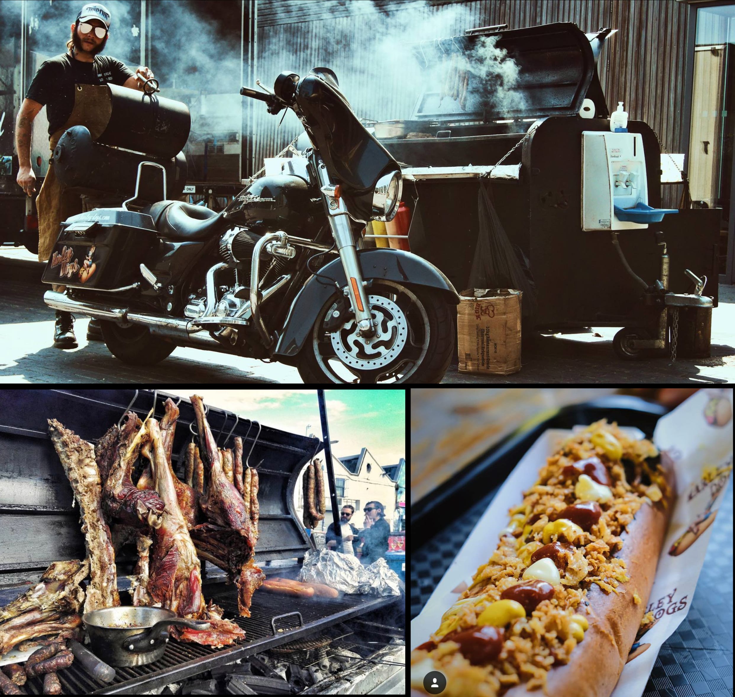 WHAT: Meat barbecue out the back of a Harley Davidson motorcycle and BBQ trailer.