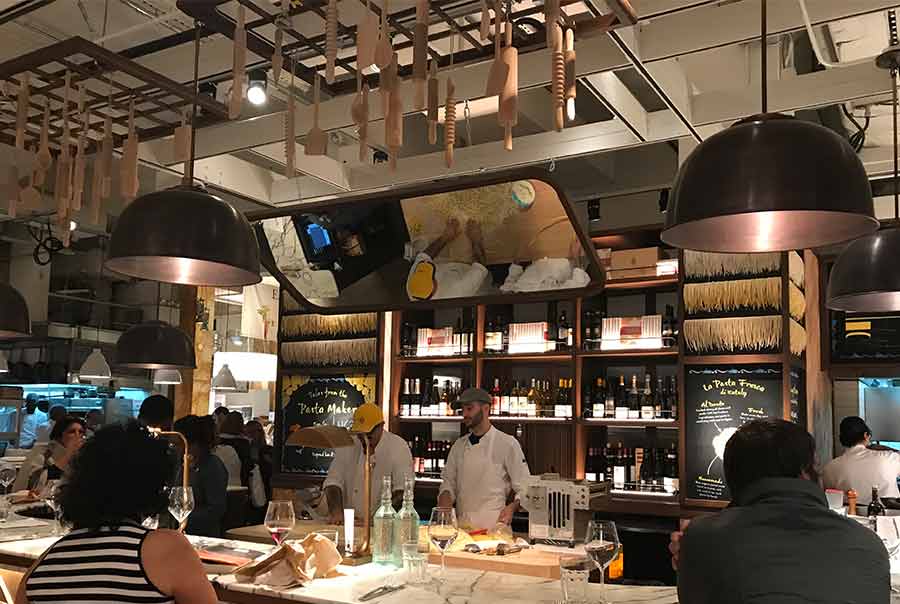 IL PASTAIO DI EATALY is an impressive and theatrical kitchen servery where you can watch all the different fresh pastas being made, then sample your favourite with a fine glass of wine.