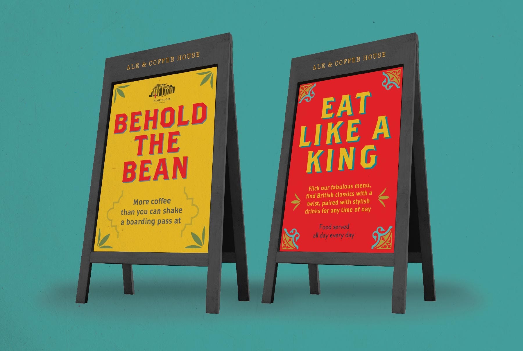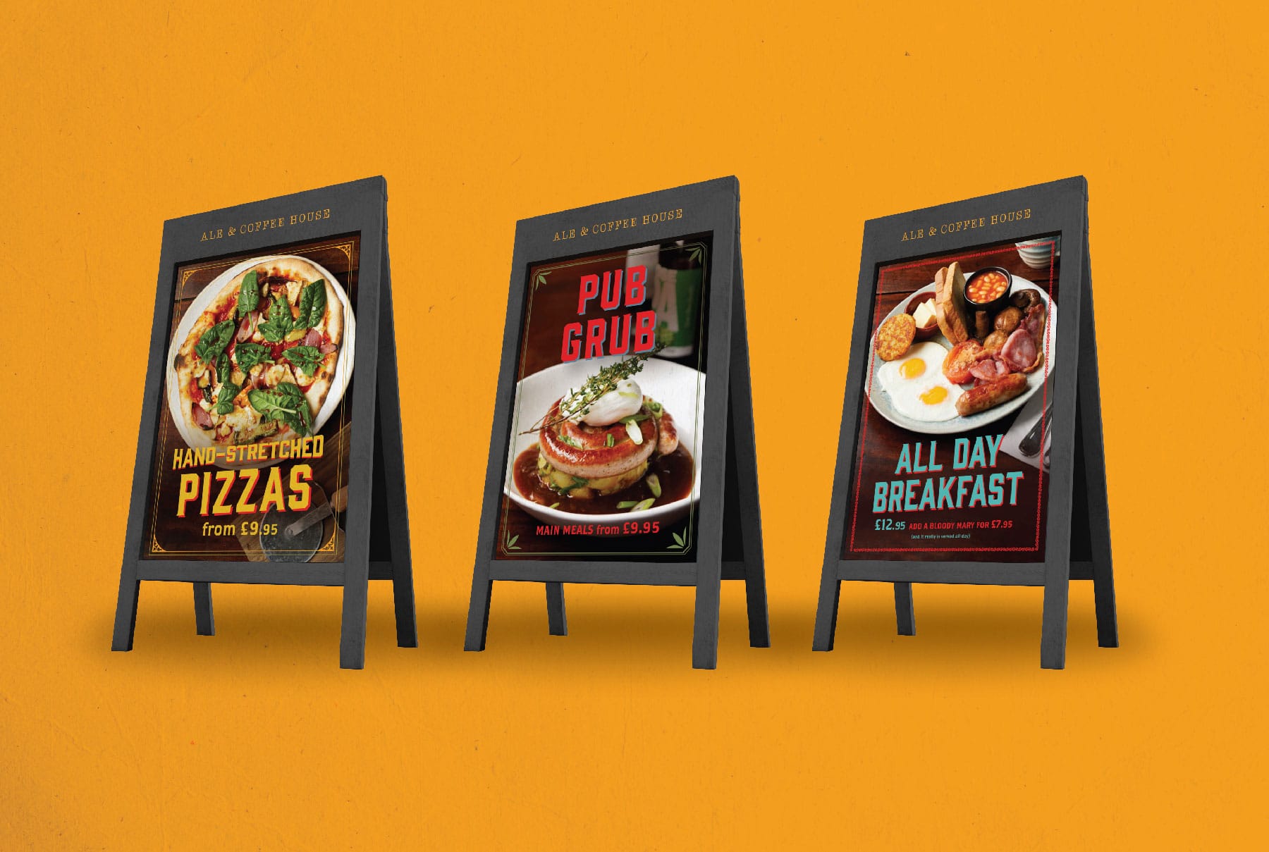 As well as Ale & Coffee House umbrella branding we created all individual location branding. Each A&C pub is a contemporary twist on the classic, with a large helping of clever humour, Britishness, and off beat thoughts conjured by the unique name. The strong, colourful site personalities come through in both the interiors as well as all customer communications – including the pub identities, food and drink menus, A-boards and uniforms.