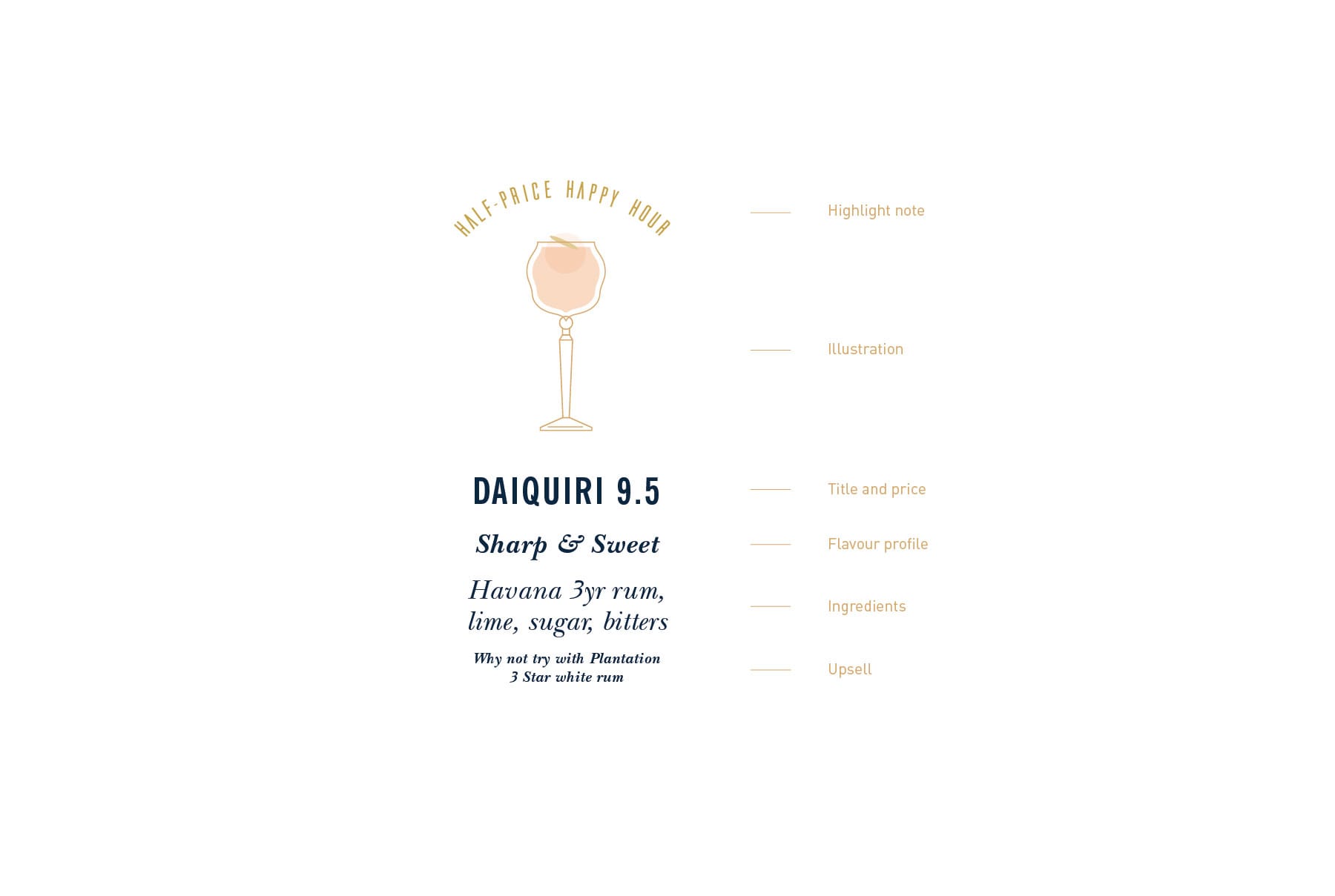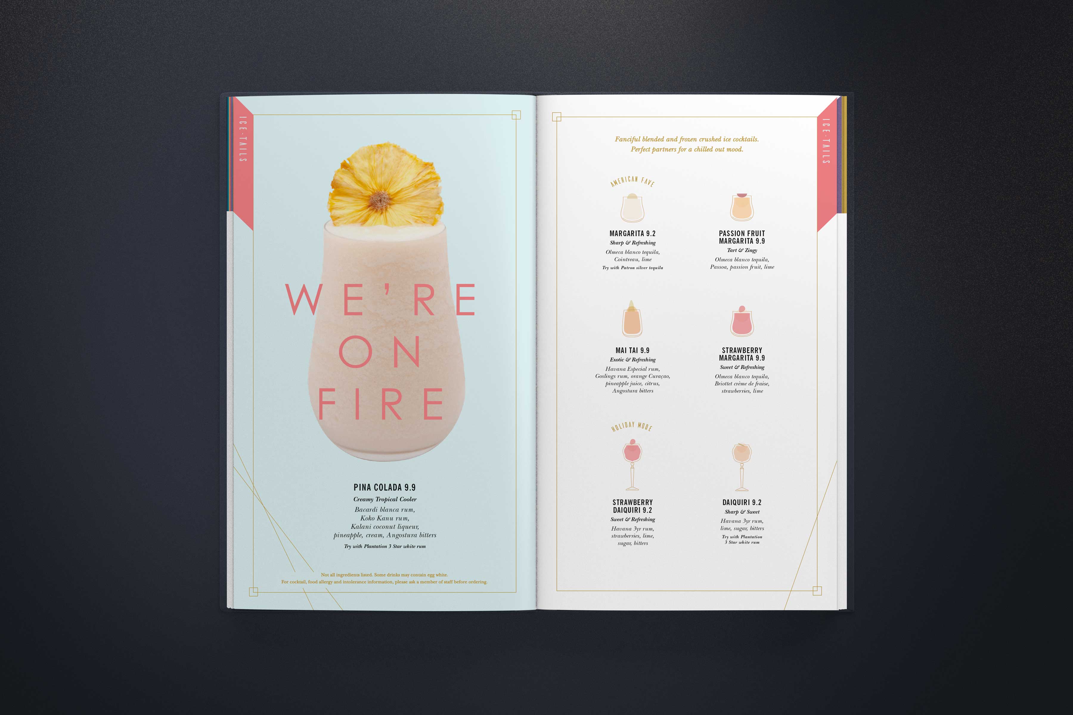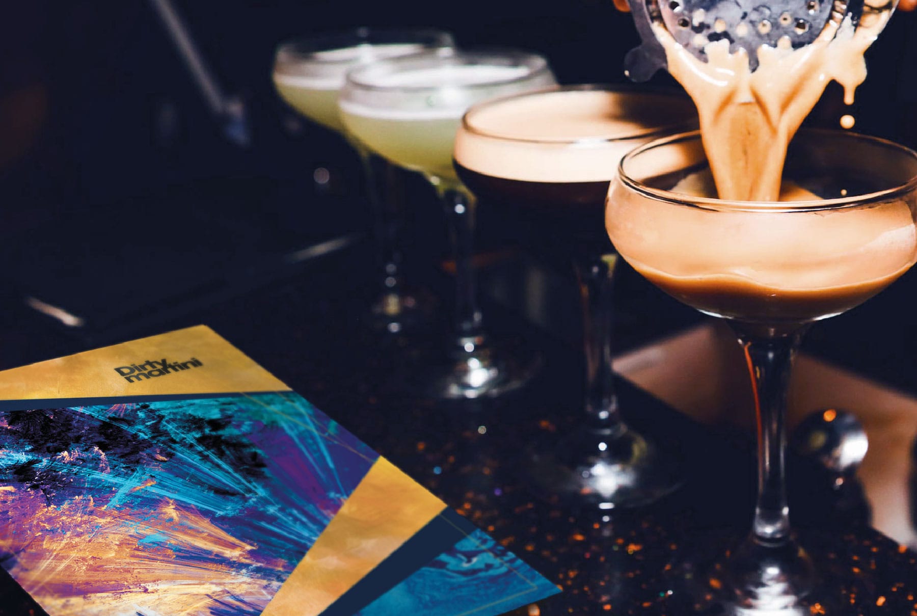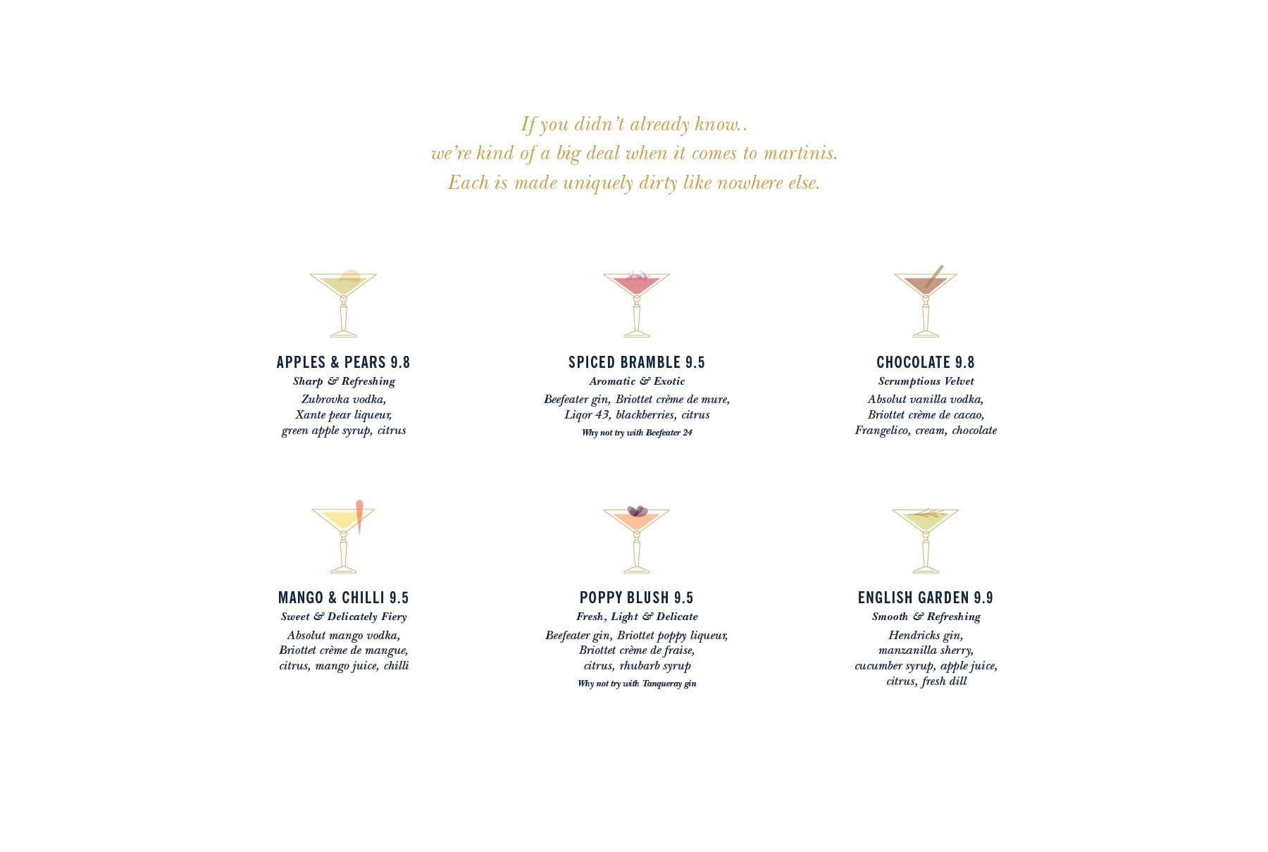 We designed a new menu for Dirty Martini, the high street cocktail bar chain. Starting with the opulent interiors for inspiration, we deconstructed the martini glass and mixed these sharp dynamic lines with the creative flair from the cocktail crafting process.