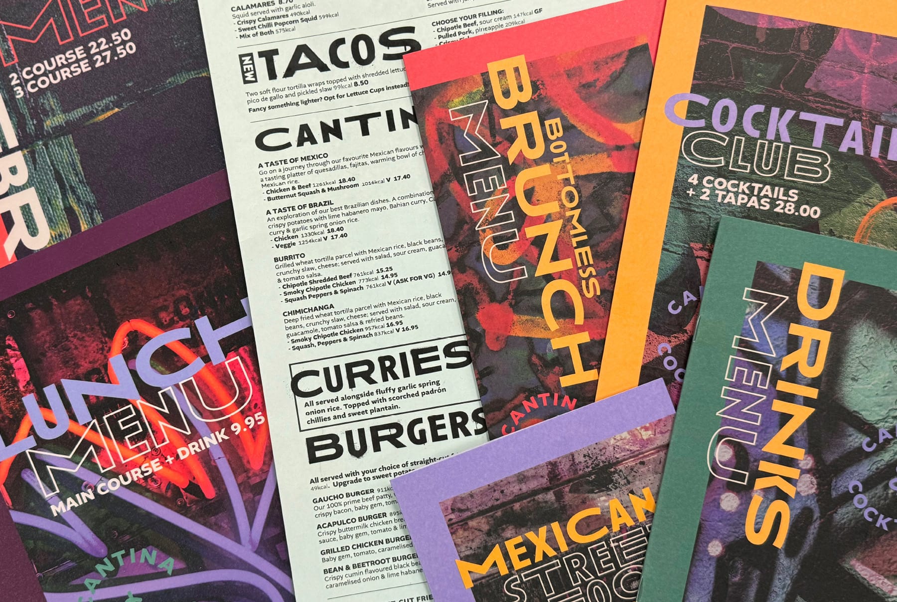 New styling for a new menu approach. From cocktail clubs to bottomless brunches, 20+ different menu designs including artwork of the entire suite.