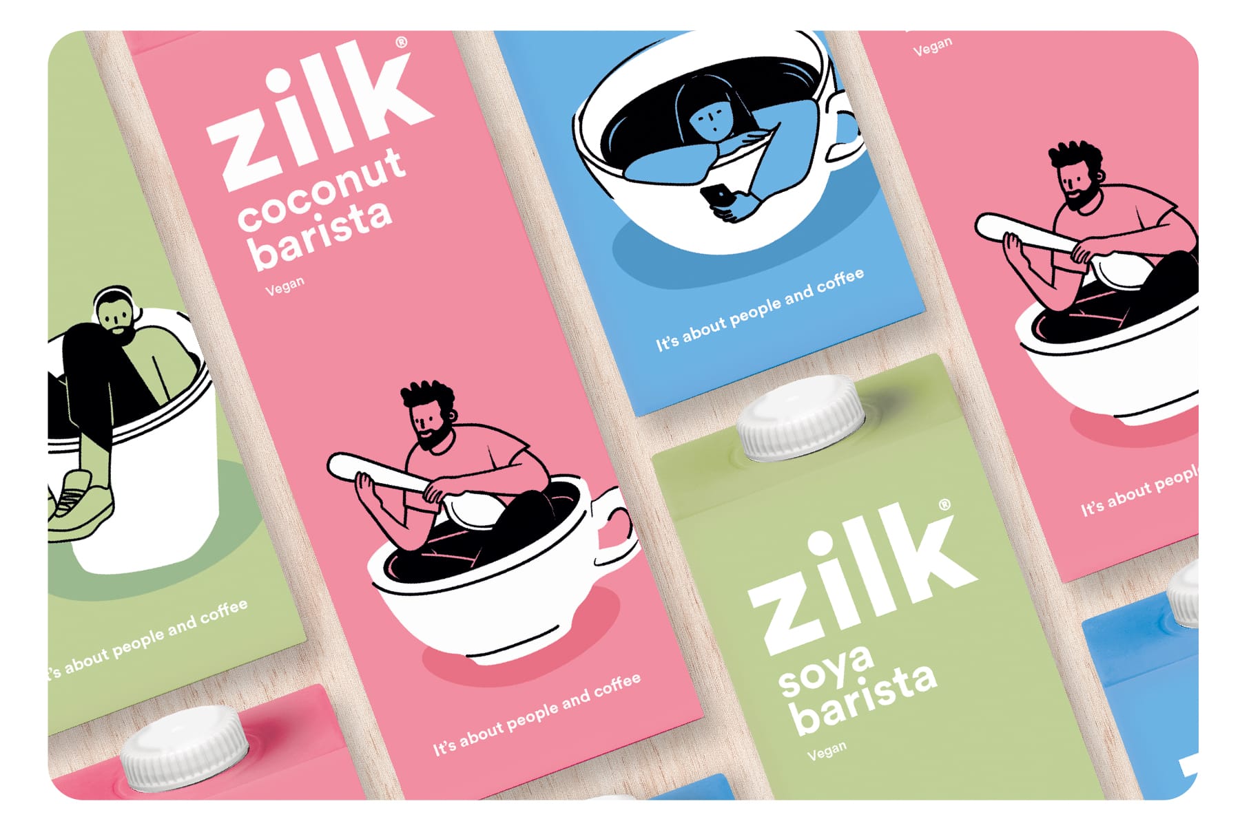 zilk is all about going deeper into the coffee experience, so our illustration style reflects this with contemporary people relaxing within a drink. Bold colours create immediate shelf stand-out against competitors and a clear differential for each product within the zilk range. All brand creative was documented in a full standards.